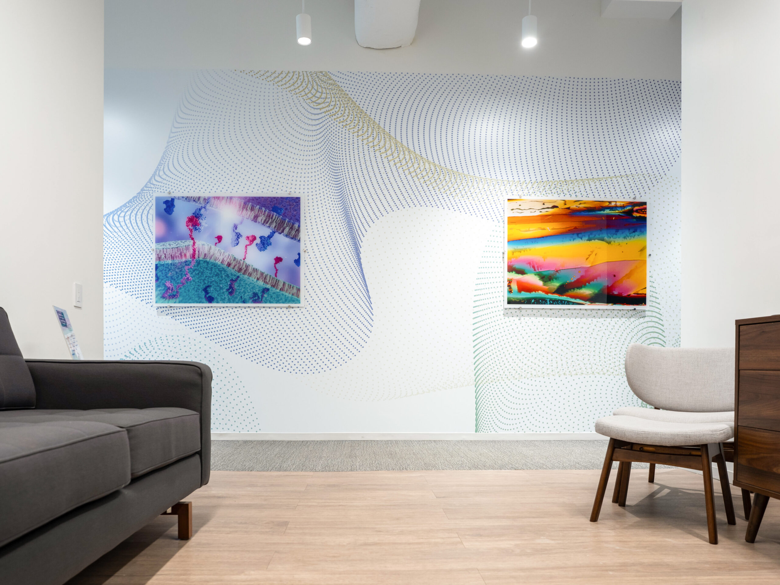 Protara Therapeutics is a New York–based biotechnology company committed to advancing transformative therapies for people with cancer and rare diseases. The firm values creativity and diverse perspectives, and uses modern scientific and regulatory innovations to speed up development. As part of their corporate office in New York City, Protara wanted to reflect this mission through their physical environment. Protara partnered with 40 VISUALS to produce a 60′ x 10′ adhesive vinyl wall covering and eight acrylic prints: six measuring 48″ × 36″ and two at 60″ × 48″. These prints showcased colored microscopic cell imagery, a perfect fit for a biotech company, and were installed by JD Graphics.