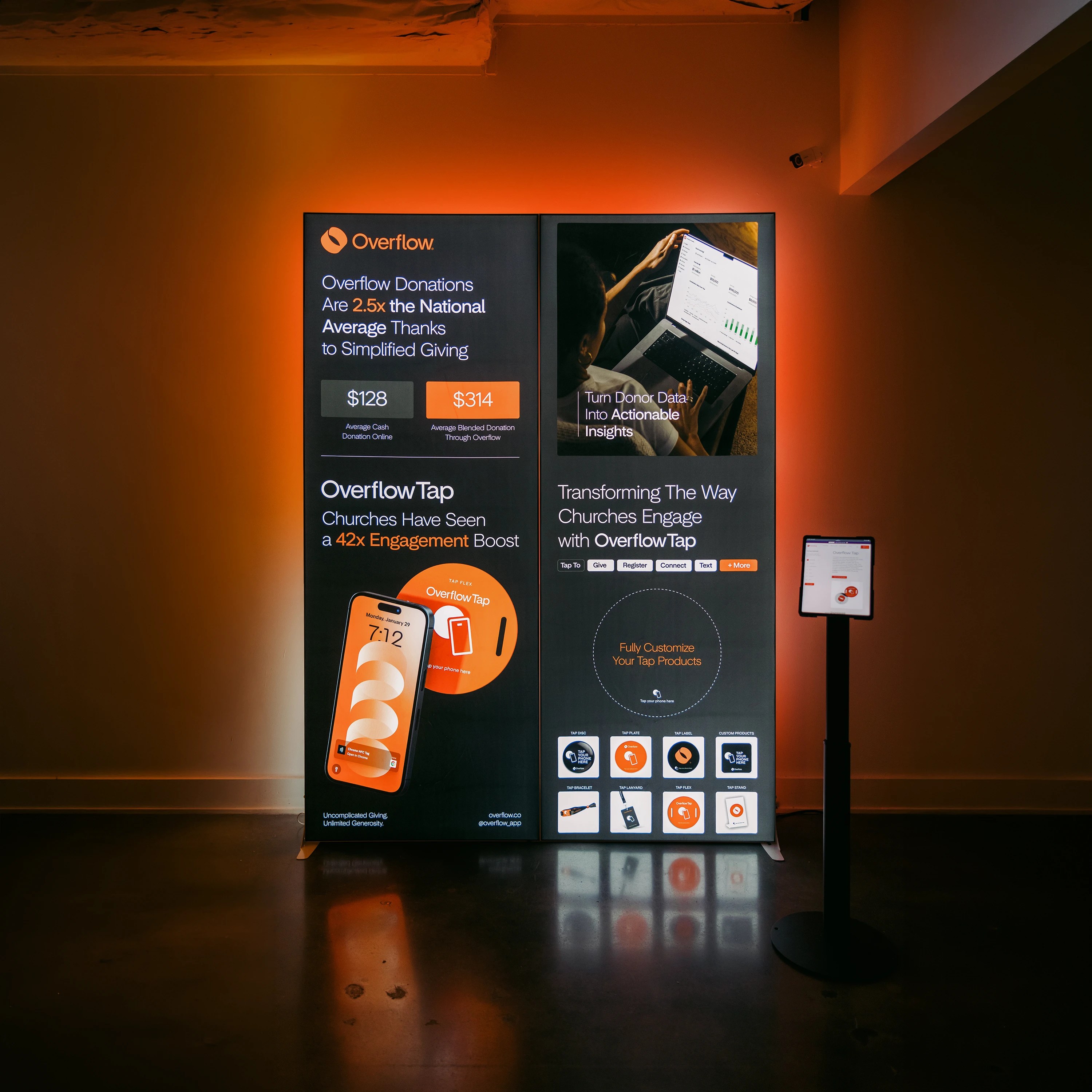 Impactful backlit displays and an interactive tablet stand kiosk create an effective brand activation station for Overflow.