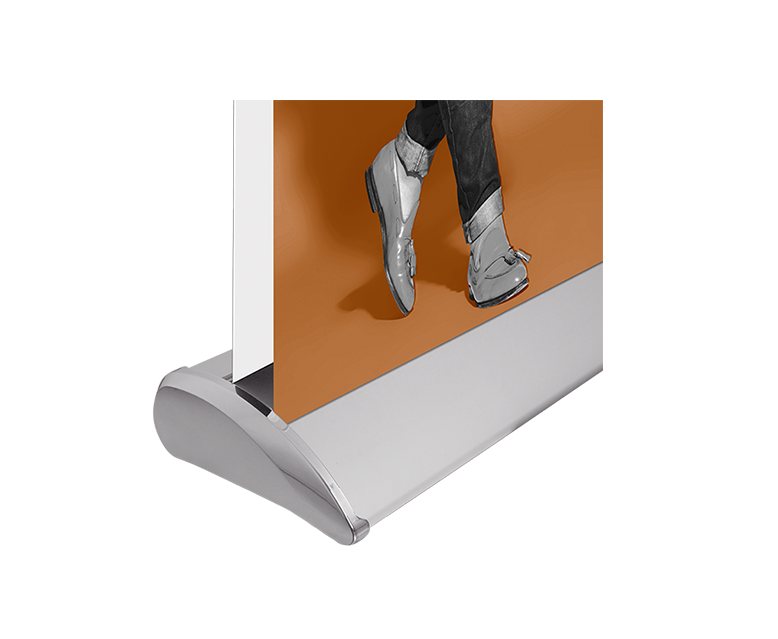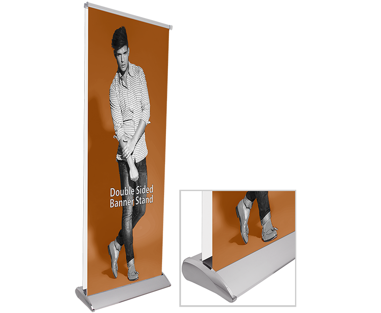 Looking for a banner stand with double the impact? Our double sided banner stand will do the job. It has a heavy duty base which gives it a sophisticated, streamline look, and features our anti-curl polyfilm so your graphics will look their best. The double sided banner stand comes with a canvas carrying case and the base can be recycled. Other key features include: Anodized silver finish, molded end plates, and 3 piece bungee corded poles.