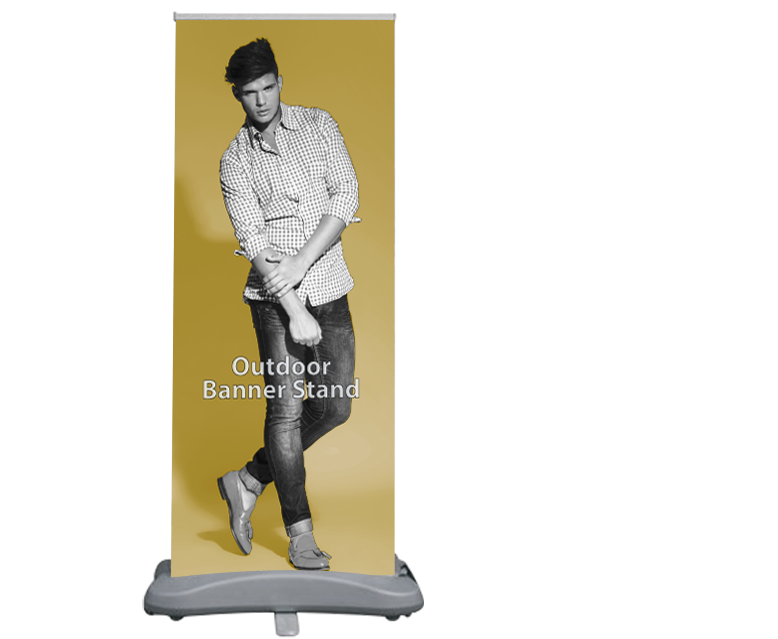 Looking for a banner stand with double the impact? The double sided outdoor banner stand will do the job. It has a heavy duty base which gives it a sophisticated, streamline look, and features an anti-curl banner media so your graphics will look their best. The double sided banner stand comes with a canvas carrying case and the base can be recycled. Other key features include:Anodized silver finish, molded end plates, and 3 piece bungee corded poles. More Images.