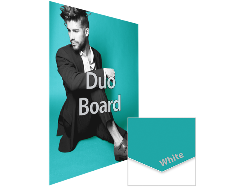 Duo Board is a two sided, printable, semi rigid, white media board that is manufactured with cellulose fibers, and laminated with a grey glue to provide blockout for two side printing. Duo Board can be used for retail point-of-sale signs and display graphics applications.