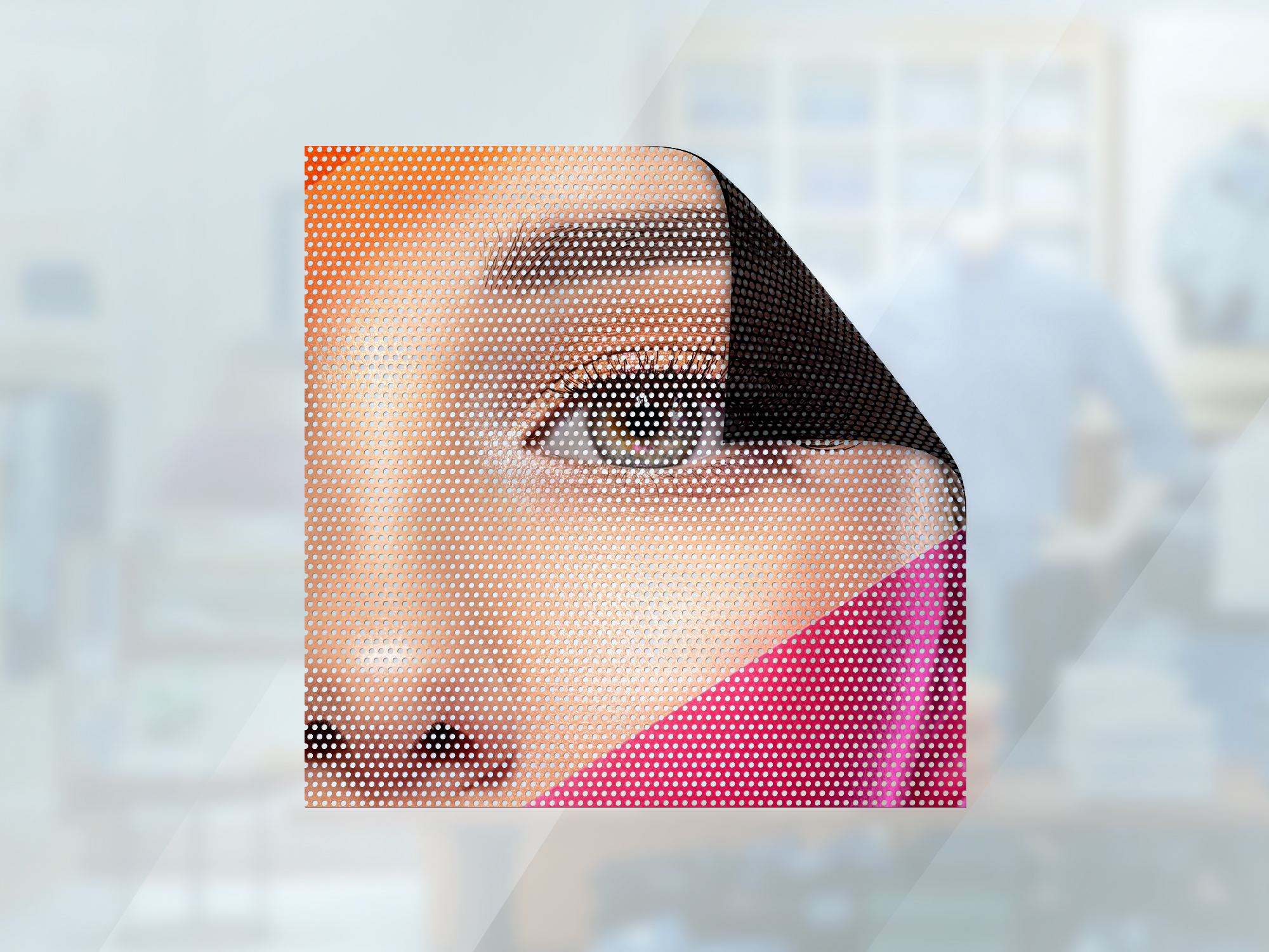 Perforated adhesive vinyl placed on the outside glass facing outward. 80/20 perforation ratio.